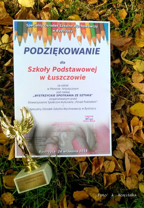 24 września 2015 uczennice naszej szkoły –Wiktoria Bieńko, Magdalena Cieślak, Natalka Wawrzyńczyk i Ola Szalast wzięły udział w „Bystrzyckich spotkaniach ze sztuką” w SOSW w Bystrzycy. Dziewczęta mogły rozwijać swoje zdolności plastyczne, wrażliwość na piękno otaczającej przyrody, techniki plastyczne. Był to też dobry czas na budowanie relacji z rówieśnikami, nawiązywanie pozytywnych relacji społecznych z dziećmi o specyficznych potrzebach oraz integracji międzyszkolnej. Wiktoria, Magda i Natalka postanowiły wziąć udział w plenerze malarskim. Wiktoria malowała na profesjonalnej sztaludze….Tematem ich obrazów był jesienny pejzaż oraz martwa natura. Ola spróbowała swoich sił w ceramice. Ulepiła misę i ozdobiła motywami jesiennych liści. Młode artystki wróciły do szkoły w bardzo dobrych nastrojach z atrakcyjnymi nagrodami, dyplomami i statuetkami.