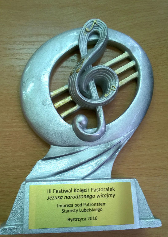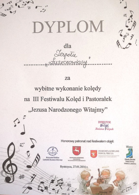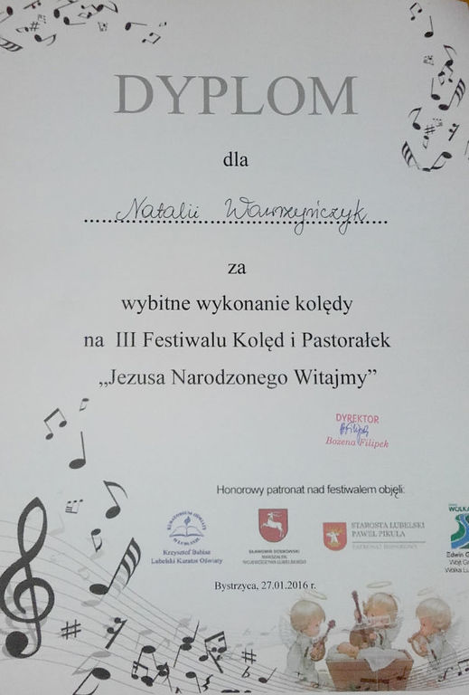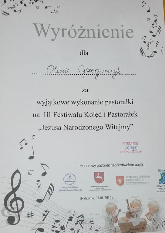 Dnia 27 stycznia 2016 roku zespół wokalny w składzie: Natalia Wawrzyńczyk, Oliwia Grzegorczyk, Ola Szalast, Wiktoria Bieńko, Julka Szewczak reprezentował naszą szkołę na III Festiwalu Kolęd i Pastorałek „Jezusa narodzonego witajmy” w Bystrzycy zorganizowanym przez Specjalistyczny Ośrodek Szkolno-Wychowawczy. Honorowy patronat nad konkursem wokalnym objęli: Prezydent Miasta Lublina, Starosta Lubelski, Marszałek Województwa Lubelskiego oraz Wójt Gminy Wólka Pan Edwin Gortat. Zespół wykonał pastorałkę współczesną pt; „Jadą kolędnicy”, wprowadzając słuchaczy w niesamowity klimat kolędowania. Dziewczęta otrzymały statuetkę, nagrody rzeczowe oraz dyplom za wybitne wykonanie utworu . W kategorii solistów zaprezentowały się Natalka w pastorałce „Cicho, cicho pastuszkowie” oraz Oliwka „Wigilia dla wędrowca”. Dziewczynki otrzymały za swój występ wokalny wyróżnienie oraz nagrody rzeczowe. Uczennice pracowały pod kierunkiem p. Agnieszki Kosińskiej. Opiekę podczas występów sprawowała również Pani Renata Sikora. Wszystkim bardzo serdecznie gratulujemy wspaniałych występów. Wszyscy spędziliśmy miło czas przy dźwiękach kolęd. Długo będziemy wspominać ten koncert! Mamusiom naszych solistek bardzo dziękujemy za kibicowanie na widowni!!!