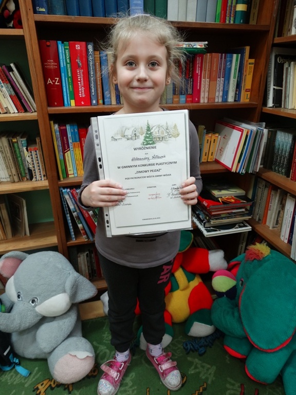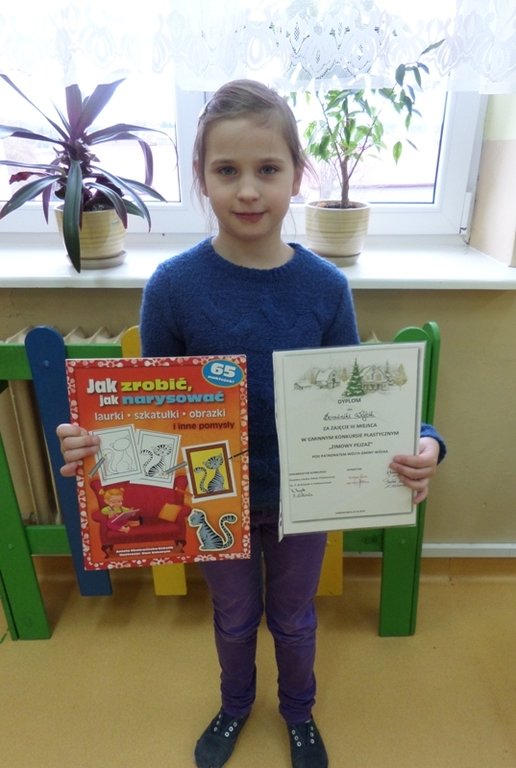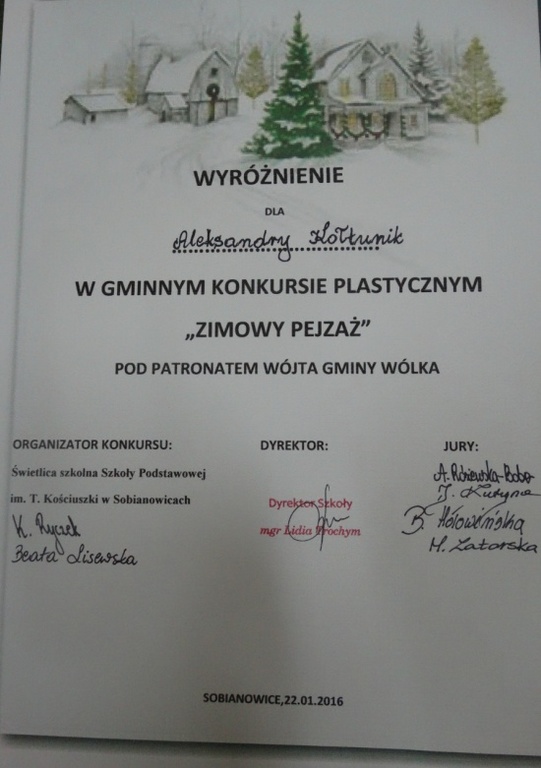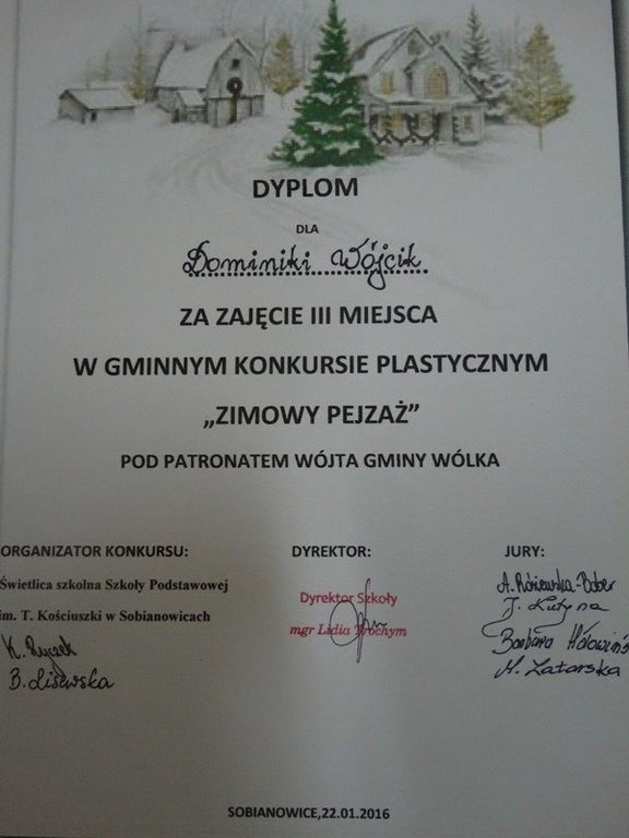 W styczniu dzieci z naszej świetlicy wzięły udział w gminnym konkursie plastycznym ,,Zimowy pejzaż'', organizowanym przez świetlicę SP w Sobianowicach. Miło nam poinformować, że III miejsce zajęła uczennica Dominika Wójcik ( kl. II), a wyróżnienie otrzymała Aleksandra Kołtunik (kl. II)