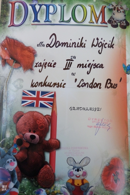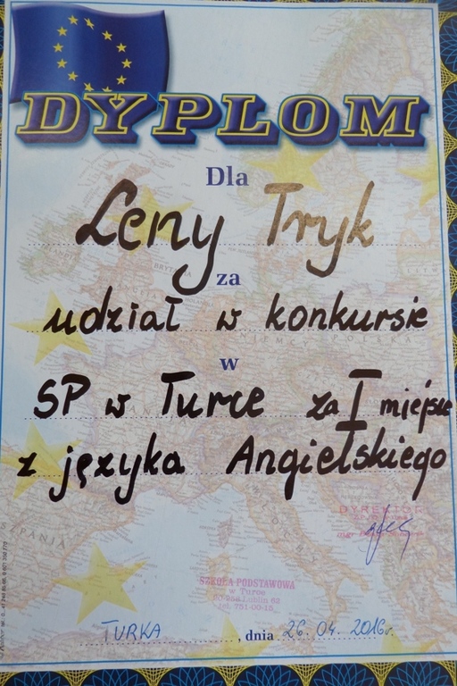 Miło nam poinformować, że w Gminnym Konkursie Plastycznym "Primary Vocabulary" zorganizowanym przez Szkołę Podstawową w Turce I miejsce zdobyła Lena Tryk- kl. Ia. Swoją pracą wyróżniła się także Dominika Wójcik- kl. II, która zajęła III miejsce.