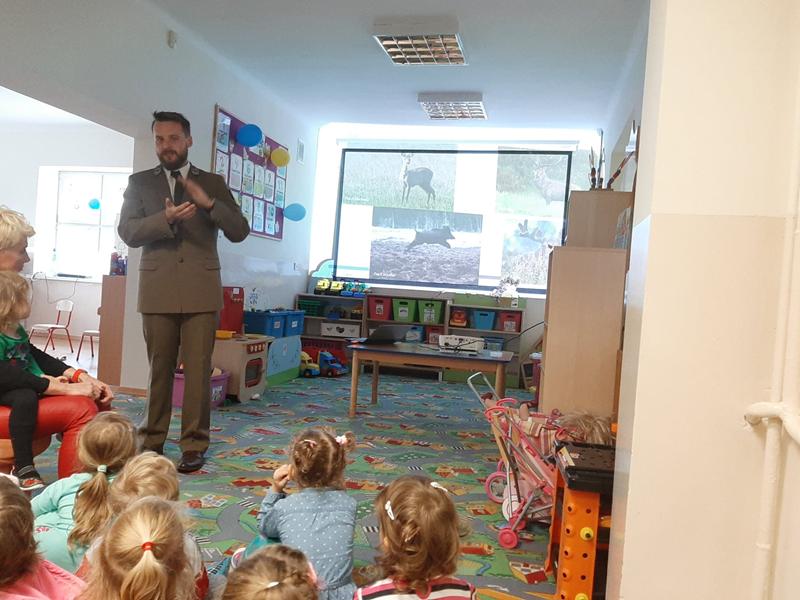 10.10.2019 r. nasze przedszkole odwiedził niezwykły gość – Leśniczy Pan Marek Tokarzewski. Celem spotkania było przekazanie dzieciom informacji na temat tego „Co zwierzęta robią zimą?”, a także zachęcanie dzieci do opiekowania się i dokarmiania zwierząt leśnych i ptaków w okresie zimy. Leśniczy zaznaczył, że człowiek jest gościem w lesie i musi szanować zwyczaje gospodarzy, czyli zwierząt w nim mieszkających. Wyjaśnił, jak prawidłowo dokarmiać zwierzęta. Podkreślał, że w czasie srogiej zimy dokarmianie jest konieczne, a jeśli zacznie się dokarmiać zwierzęta, nie można tego zaniechać. Podczas spotkania dzieci miały również okazję poznać życie wybranych zwierząt (jeża, wiewiórki, dzika, gronostaja ) zamieszkujących lasy naszej okolicy. Mamy nadzieję, że przekazane informacje na długo pozostaną w pamięci najmłodszych. Wszyscy gorąco podziękowaliśmy Panu Markowi za miłe spotkanie.