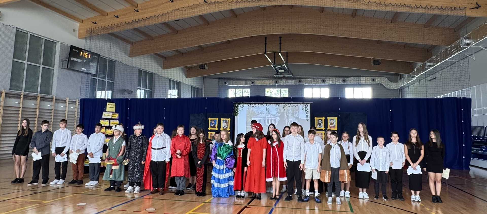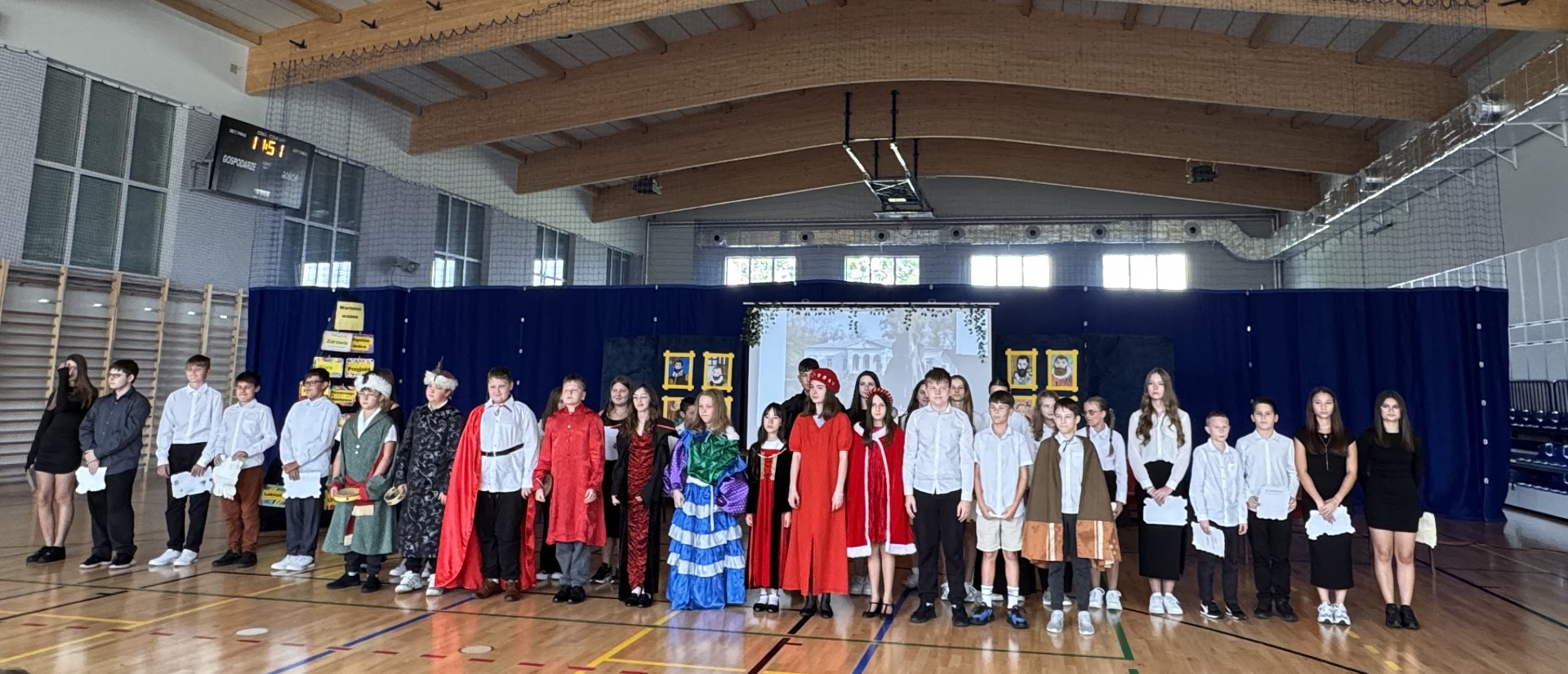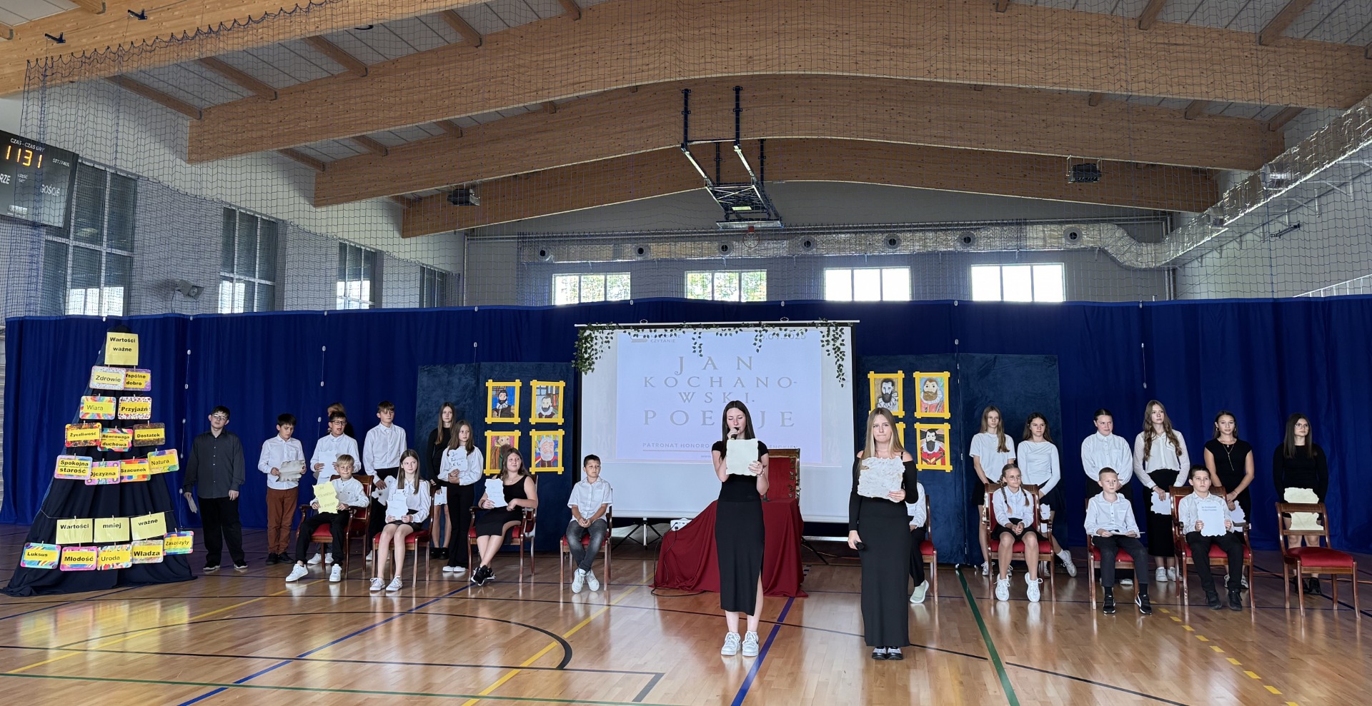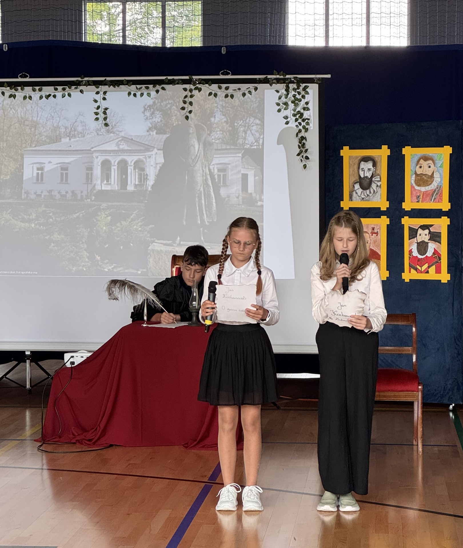 W bieżącym roku akcja Narodowego Czytania w naszej szkole odbyła się 16 września. Tym razem jej tematem była poezja Jana Kochanowskiego, renesansowego poety, którego nazwano „ojcem poezji polskiej”. Uczniowie klas V, VII i VIII, czytając fraszki, pieśni i treny Mistrza z Czarnolasu przekonywali, że wartości, które przywoływał on w swoich utworach są nam bliskie. A wiersze napisane przepiękną polszczyzną, pełne humoru, mądrych rad, zadumy nad światem, idei humanizmu, refleksji obywatelskiej i troski o Ojczyznę to niezwykła kronika myśli i obyczajów w dawnej Rzeczpospolitej, która łączy pokolenia i jest nadal aktualna. Prace plastyczne uczniów będące elementem dekoracji, psalm „Kleszczmy rękoma” zaśpiewany przez uczniów klasy VI, elementy tańca, muzyka, kostiumy nawiązujące do epoki renesansu, dopełniły prezentację utworów poetyckich i pozwoliły wszystkim uczestnikom spotkania poczuć nastrój epoki, w której żył Jan Kochanowski.