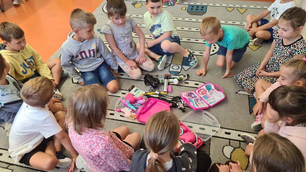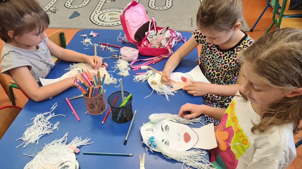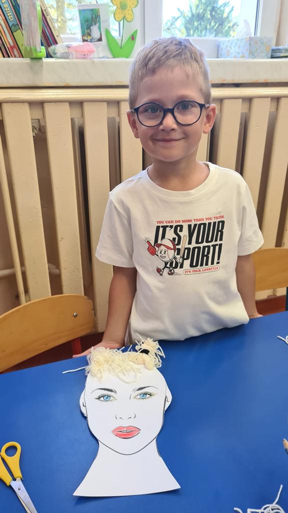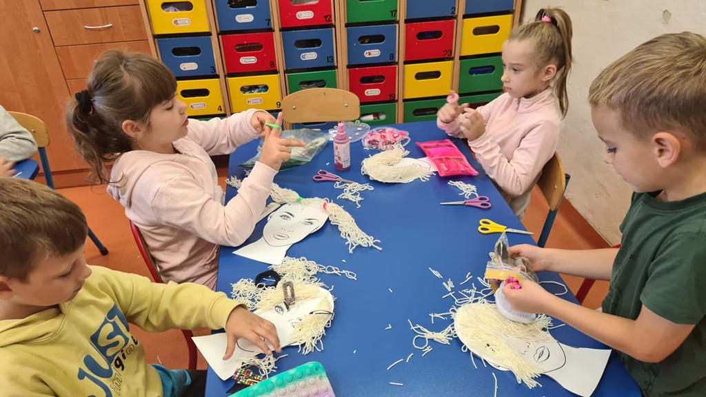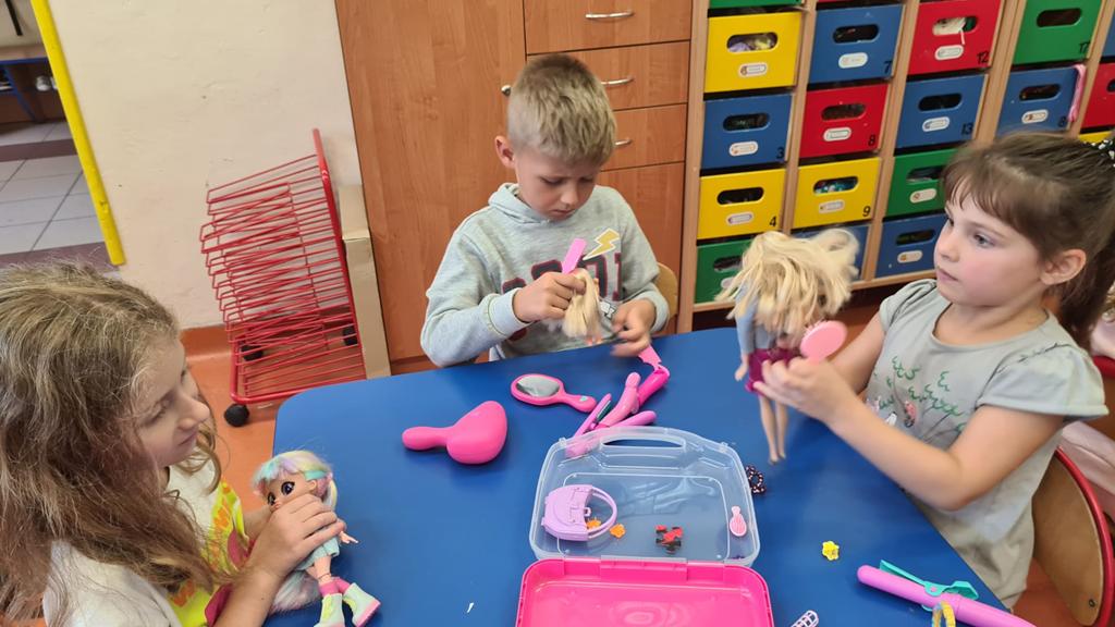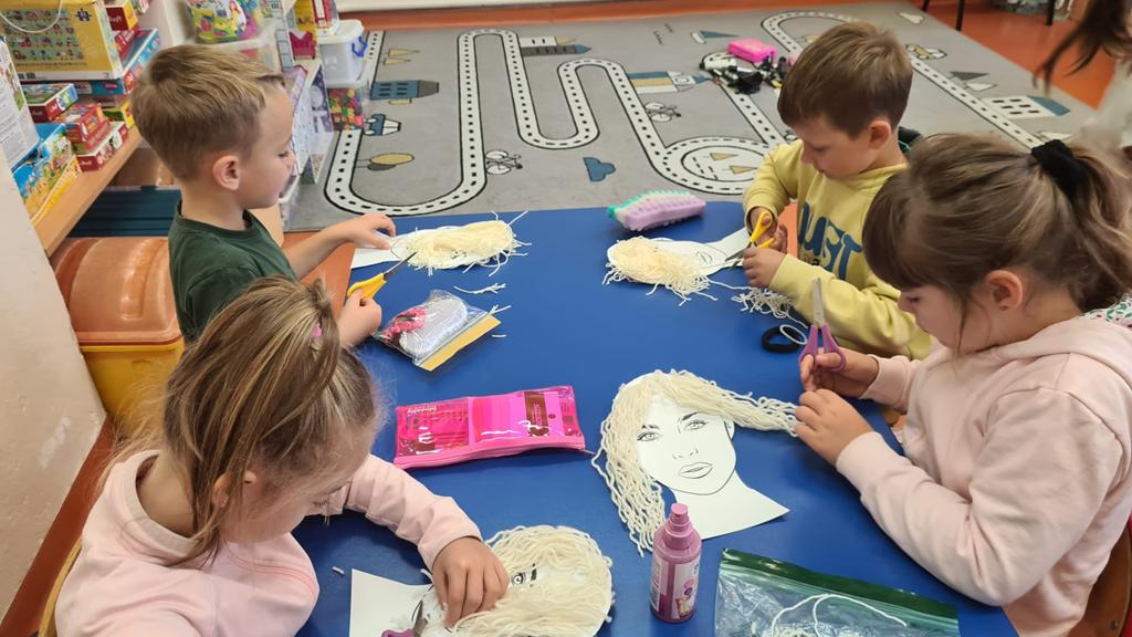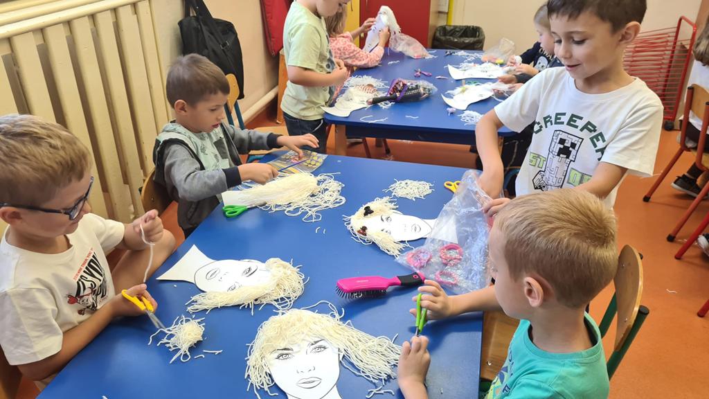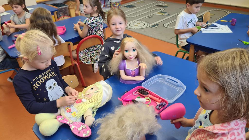 W grupie 6 – latków: „Kangurki” prowadzona jest innowacja „ Przedszkolak w świecie zawodów”’ celem której jest preorientacja zawodowa w przedszkolu, czyli poznawanie różnych zawodów. W miesiącu wrześniu przedszkolaki poznawały zawód fryzjera. Obejrzały film o zawodzie fryzjera, z którego dowiedziały się, na czym polega ten zawód. Poznały także akcesoria, które wykorzystuje fryzjer w swojej pracy. Następnie próbowały swoich sił w zawodzie fryzjera – miały okazję wykonać fryzury na przygotowanych szablonach lalek. Dzieciaki wykazały się dużą kreatywnością: obcinały włóczkowe włosy, upinały fryzury, zaplatały warkoczyki. Doskonaliły także motorykę małą podczas cięcia papierowych fryzur po śladach. Zabawa we fryzjera tak się dzieciom spodobała, że powstały salony fryzjerskie, w których przedszkolaki testowały różnorodne fryzury na manekinach fryzjerskich i swoich lalkach. To były inspirujące i pełne radości zajęcia.