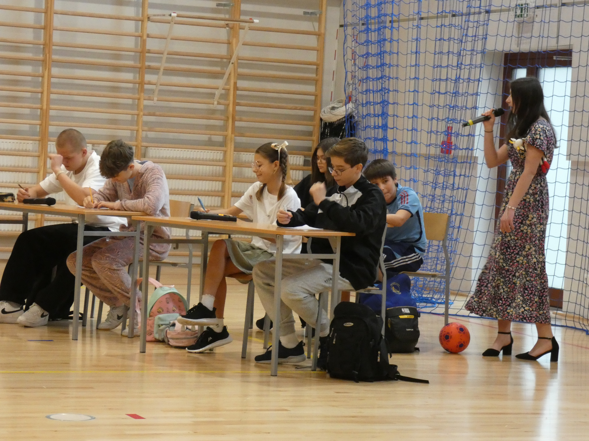 Uczniowie w zabawny sposób naśladowali szkolne sytuacje i cytowali znane powiedzonka swoich nauczycieli, czym wywołali wiele uśmiechów na twarzach publiczności. Występ przygotowali uczniowie klasy ósmej, wspierani przez jedną uczennicę z klasy piątej oraz ucznia z klasy siódmej. Całość została urozmaicona występami chóru szkolnego, który zaprezentował piosenki poświęcone nauczycielom.