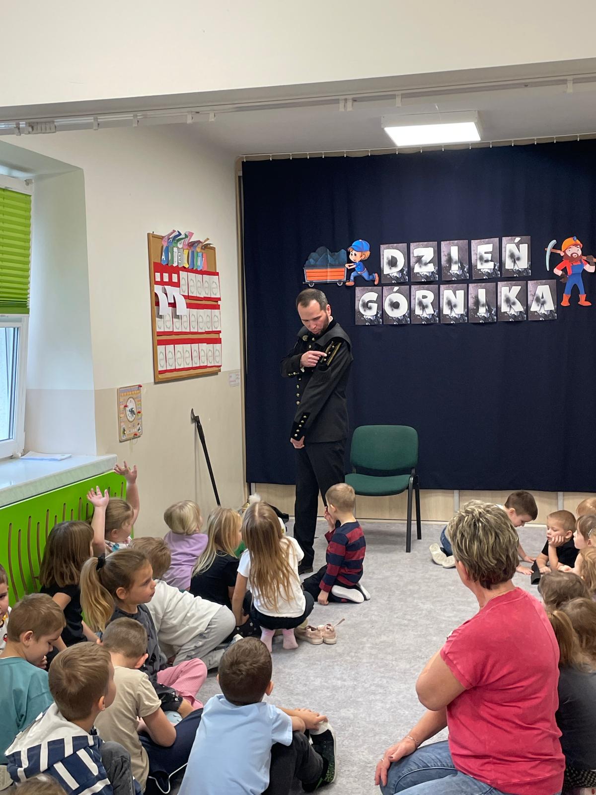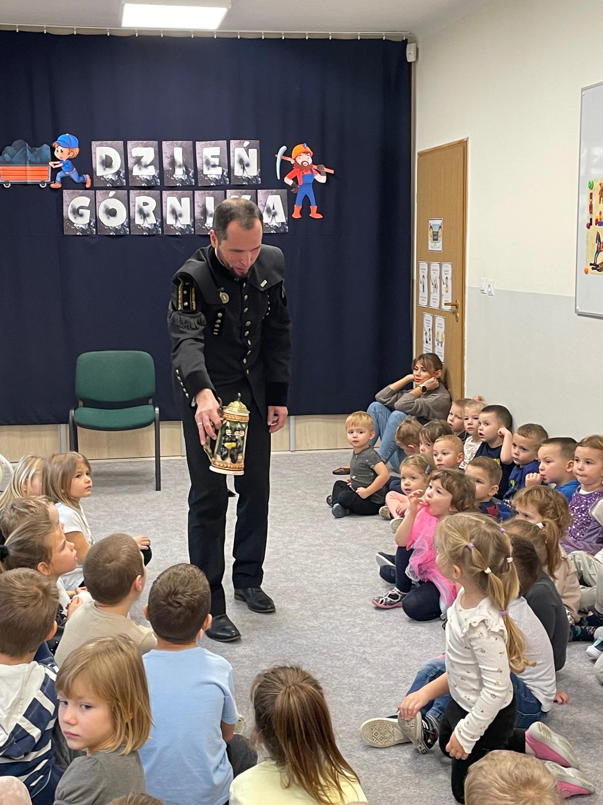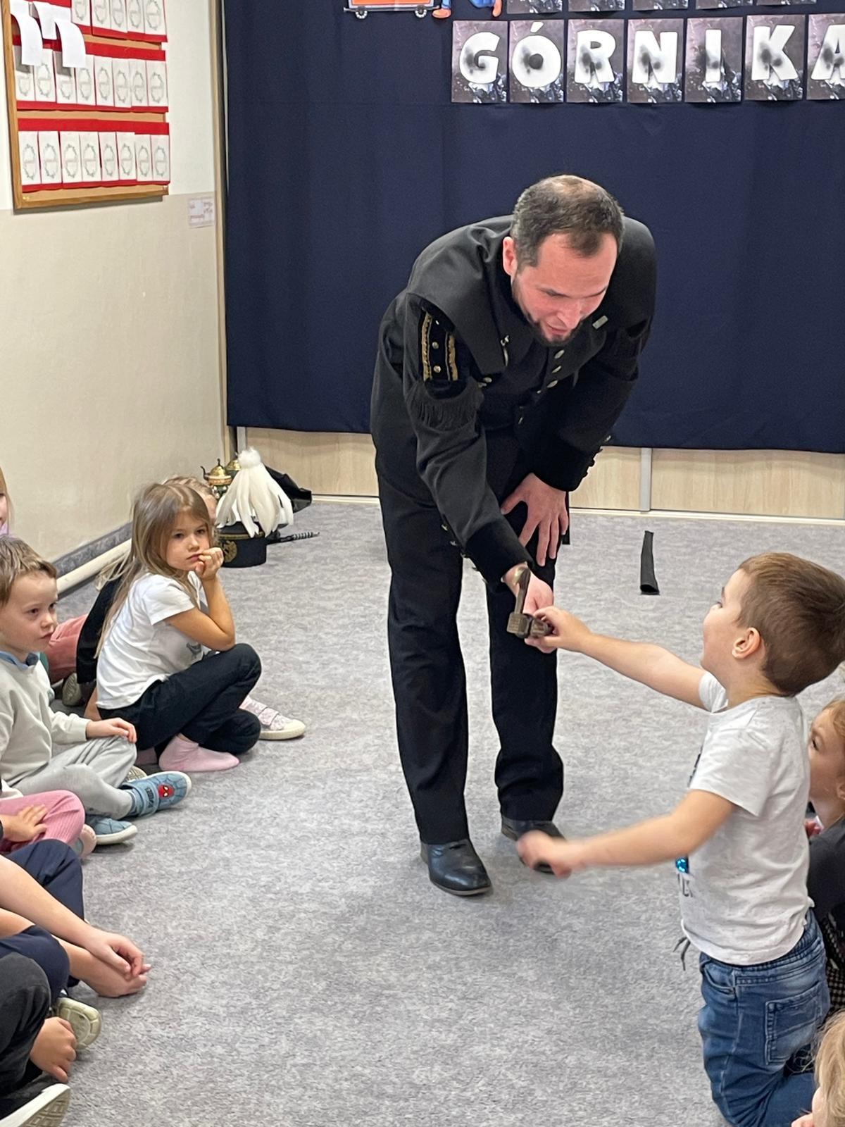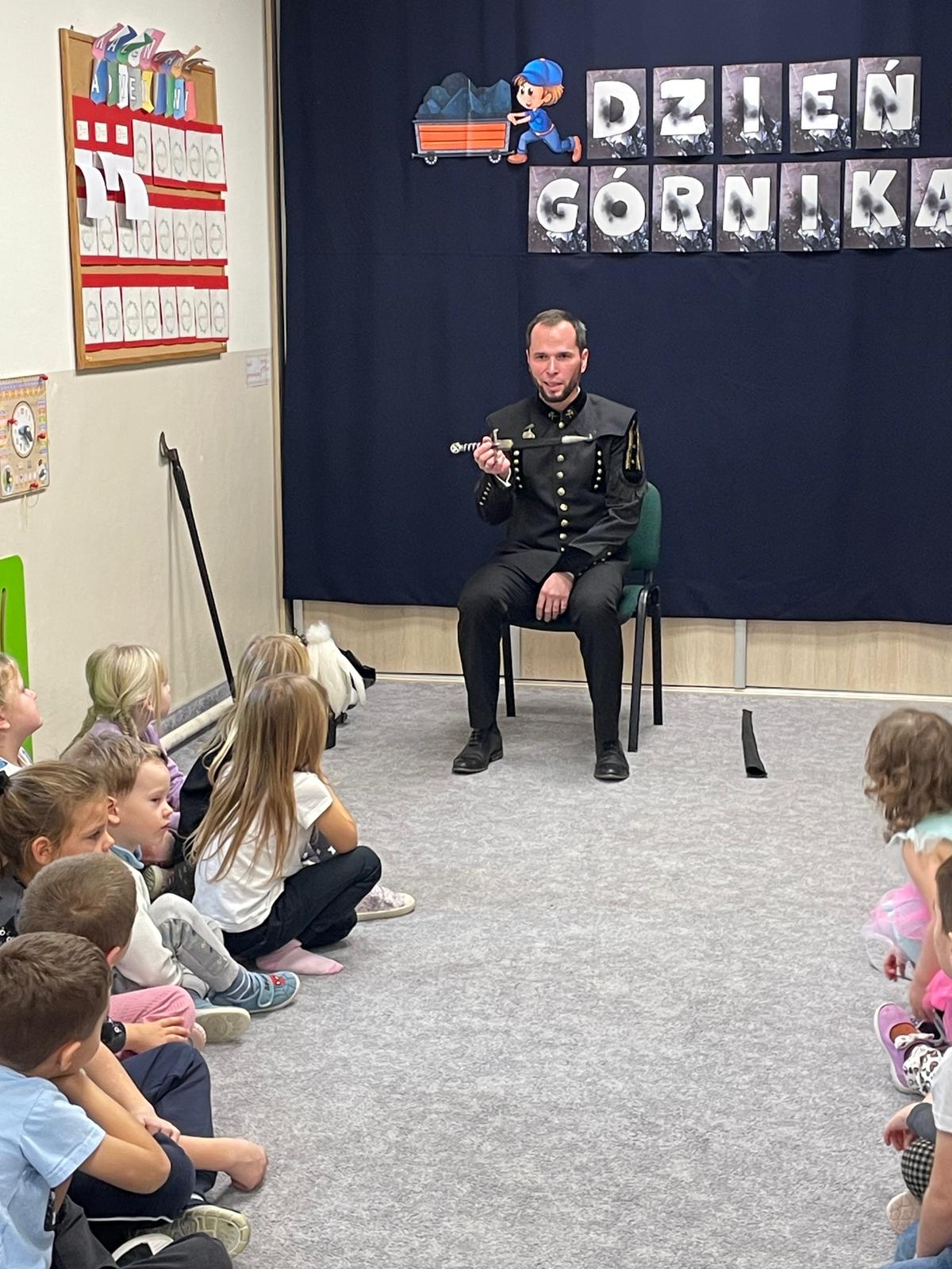 4 grudnia nasze przedszkole odwiedził wyjątkowy gość- górnik w galowym stroju Pan Grzegorz Listoś. Dzieci miały okazję poznać tajniki pracy pod ziemią, obejrzeć górniczy mundur z bliska oraz dowiedzieć się, co oznaczają kolory pióropuszy na czapce górniczejj. Największą atrakcją okazały się rekwizyty, które górnik przyniósł ze sobą. Przedszkolaki słuchały z ogromnym zainteresowaniem, zadawały mnóstwo pytań i dowiedziały się, jak ważna i trudna jest praca górnika. Na zakończenie spotkania wszytskie dzieci złozyły naszemu gościowi życzenia z okazji Barbórki, wręczyły prezent oraz podziękowały za ciekawą lekcję.